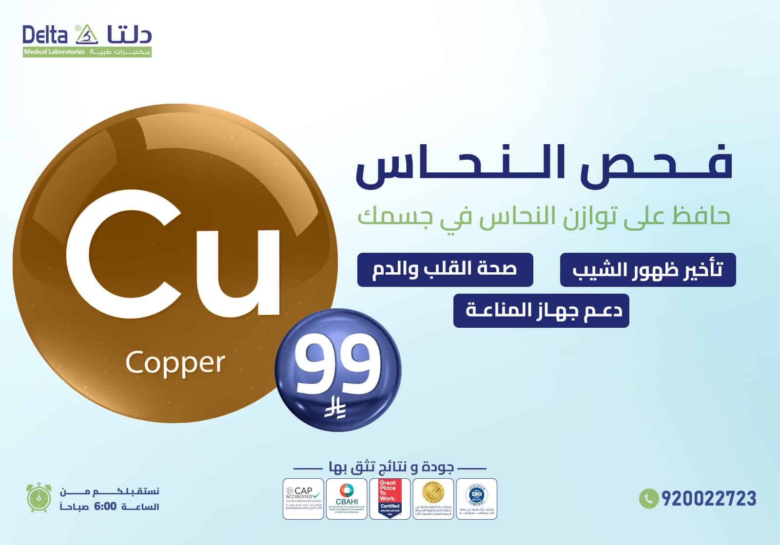 تحليل مخبري يقيس مستوى النحاس في الدم، وهو معدن أساسي لدعم الجهاز العصبي والمناعي وتكوين خلايا الدم الحمراء. يساعد الفحص في الكشف عن حالات النقص أو الزيادة المرتبطة بفقر الدم، اضطرابات الأعصاب، أو أمراض الكبد، ويدعم التقييم الصحي الدقيق والتشخيص المبكر.