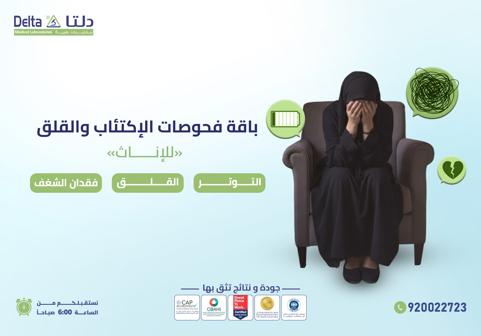 هل تعلمِ أن التغيرات المزاجية والنفسية ربُما قد تكون علامة على وجود خلل في المؤشرات الحيوية في الجسم، مما يصعب السيطرة على مشاعر الحزن والاكتئاب، ولكن مع باقات الاكتئاب والقلق عند النساء، يُمكنكِ التخلص من هذه التغيرات وفهم العوامل المؤثرة على صحتك النفسية، لتتمكني من التعامل مع الضغوط اليومية بثقة وراحة أكبر.