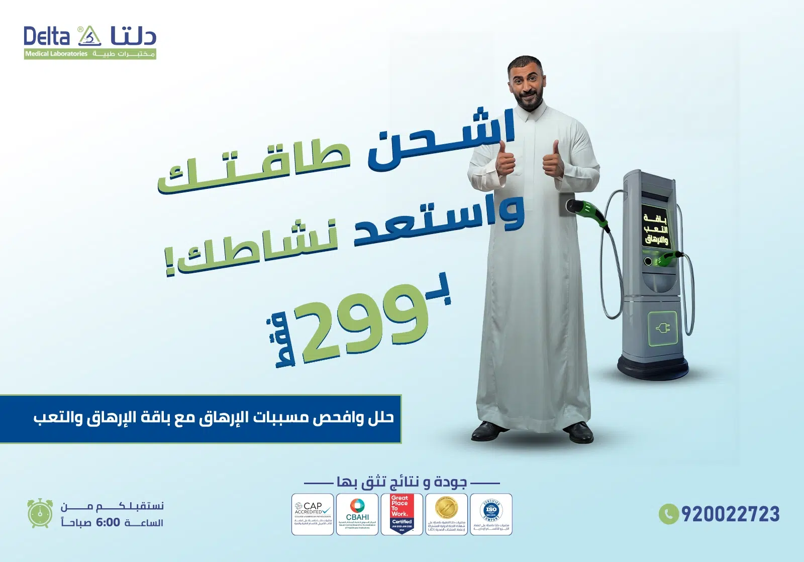 هل تشعر بالإرهاق المتكرر أو قلة الطاقة دون سبب واضح؟ قلة النوم والارق الغير مبرر؟ فكثير من الأسباب الصحية الخفية قد تكون وراء ذلك، تعرف الان على أهم مسببات التعب مع باقة التعب والارهاق لتساعدك على كشف أهم العوامل المؤثرة في نشاطك اليومي تُمكنك من الحصول على صورة واضحة عن صحة جسمك .