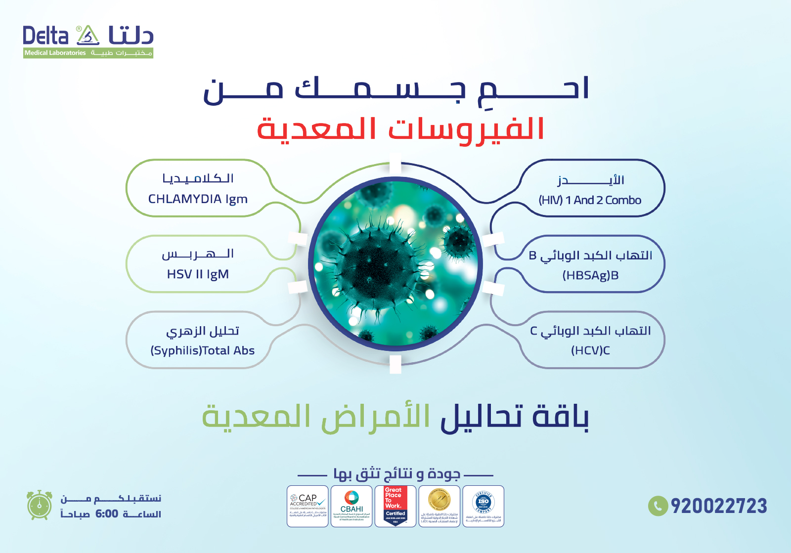 تُعد الأمراض المعدية الخطر الخفي الذي يُمكن أن تُصاب به دون أن تدري، سواء عن طريق الدم أو الاتصال الجنسي، لذا لا تنتظر ظهور الأعراض وبادر بحجز باقة الأمراض المعدية الأساسية، التي تُساعدك في الكشف المُبكر عن أكثر الأمراض شيوعًا، مثل: الأيدز والتهاب الكبد الوبائي بنوعيه (B، C)، إلى جانب مجموعة آخرى من الأمراض التي تهدد صحتك وصحة المجتمع بأكمله.