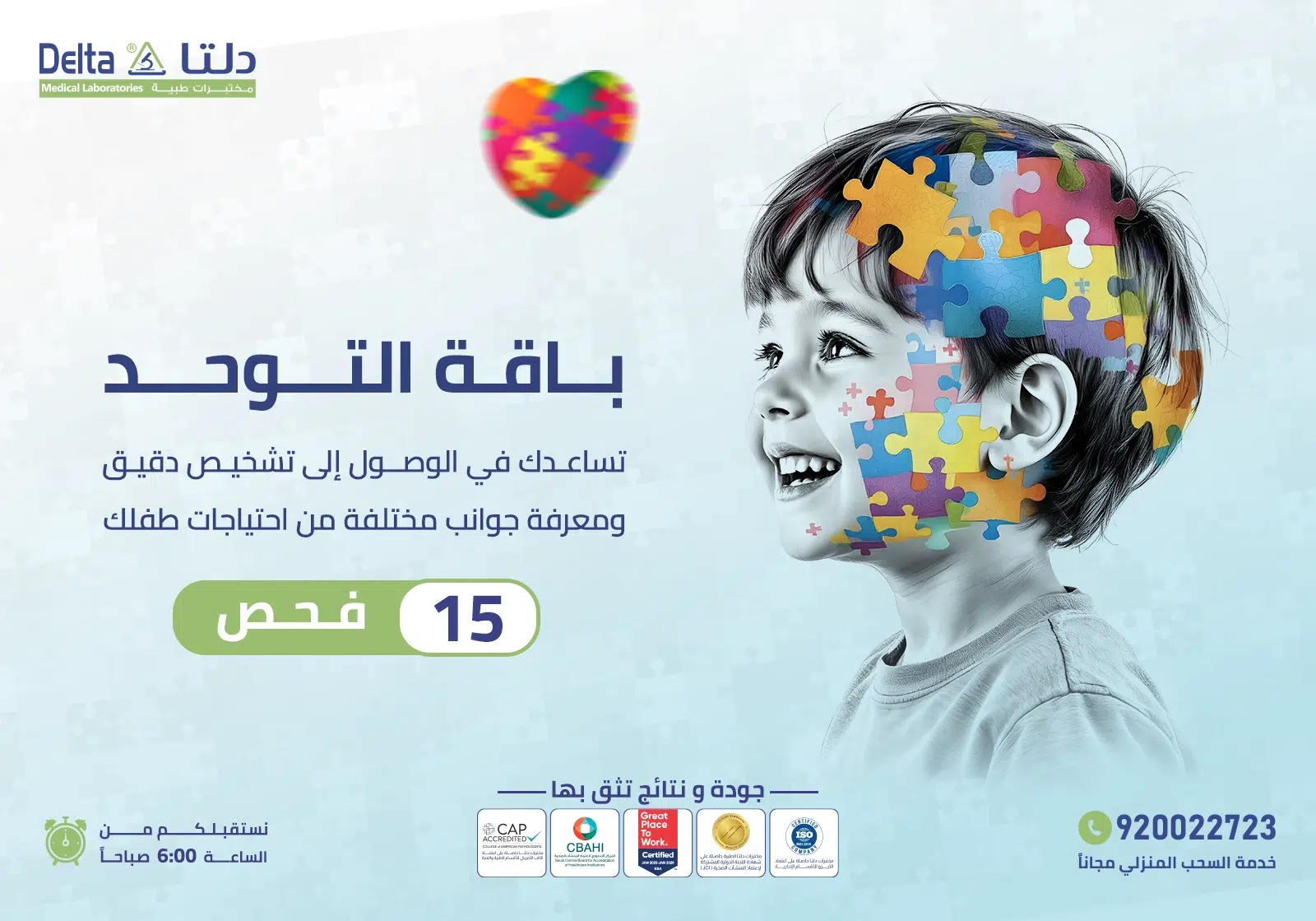 تشخيص طيف التوحد لا يعني نهاية الطريق ، بل هو طفل مميز يحتاج منكِ إلى دعم ورعاية صحية خاصة ، لذلك، نقدم لكم باقة التوحد التي تُتيح إلقاء نظرة شاملة حول صحة طفلكم، مما يُساعدكم على فهم احتياجاته الهرمونية والمناعية ومتابعة مؤشراته الحيوية، وذلك من خلال فحوصات أساسية ، لتتمكنوا من رعاية طفلكم ودعمه بشكل أفضل .