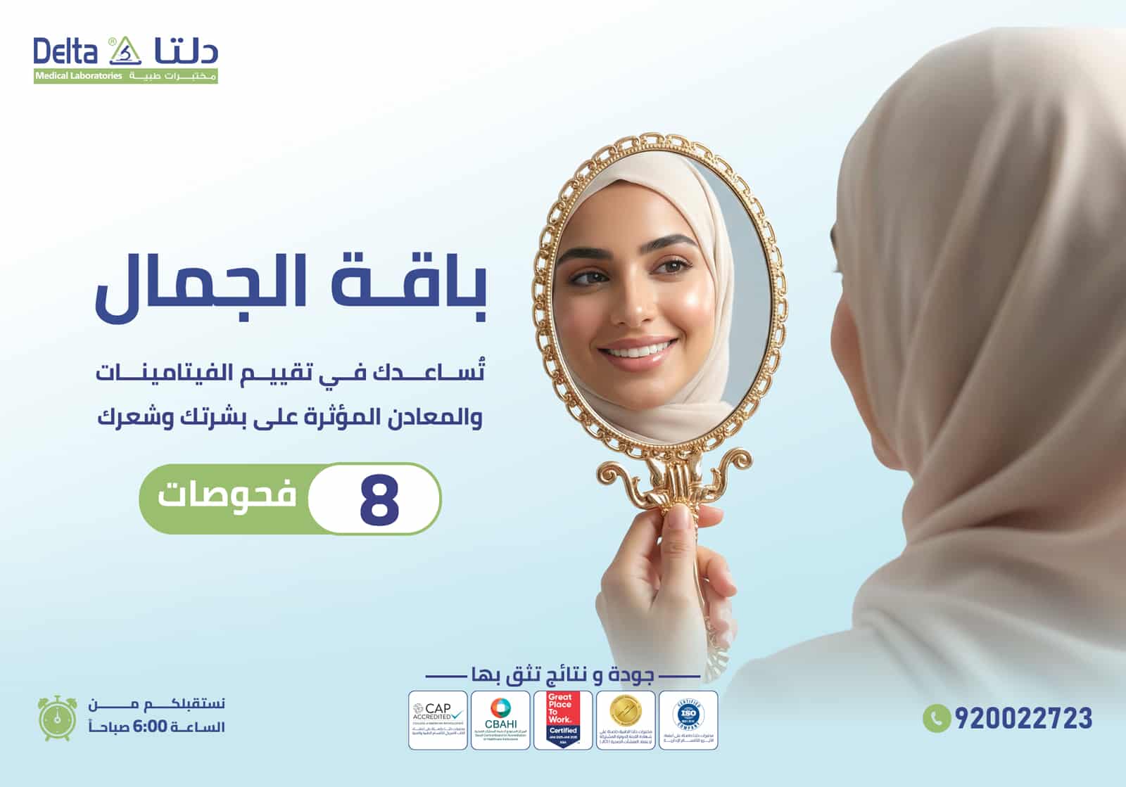 اعتني بجمالك وبشرتك وحافظي عليها مع مرور الزمن من خلال الاطمئنان على العناصر الأساسية حيث توفر باقة الجمال أهم الفحوصات التي تخص صحة البشرة وقوة الشعر ومؤشرات الجمال لأنك تستحقين التألق