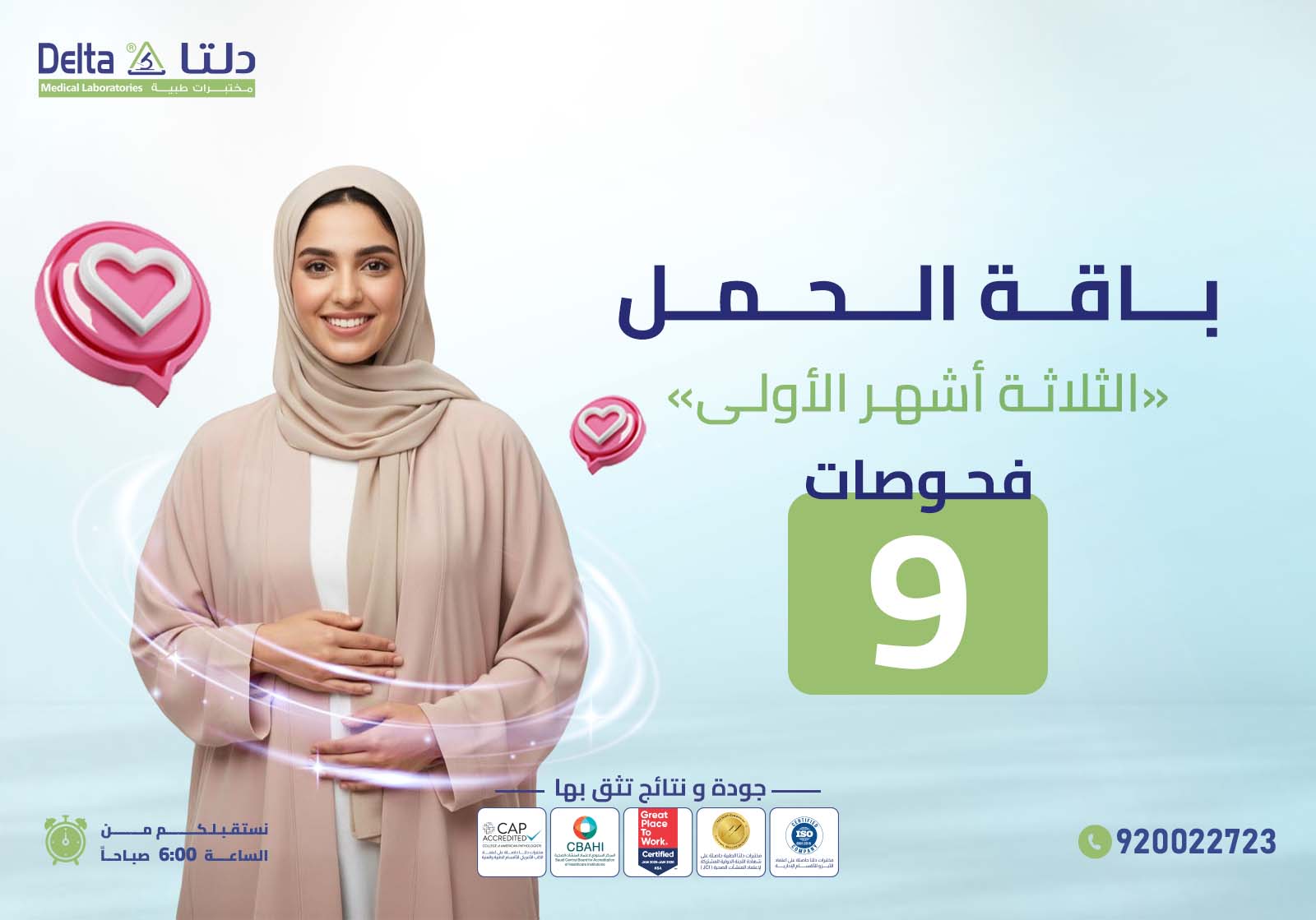 تحمل اللحظة الأولى للحمل الكثير من المشاعر والتساؤلات، مثل التحاليل اللازمة لمتابعة الحمل، وما أفضل توقيت لإجرائها، وفي الحقيقة تعمل باقة الحمل (الثلاث أشهر الأولى) على الإجابة على كل هذه التساؤلات، حيث أنها تضم أهم الفحوصات الموصى بها من الأطباء، فلا تتردي في حجز الباقة لتطمئني على صحة حملك واستقراره.