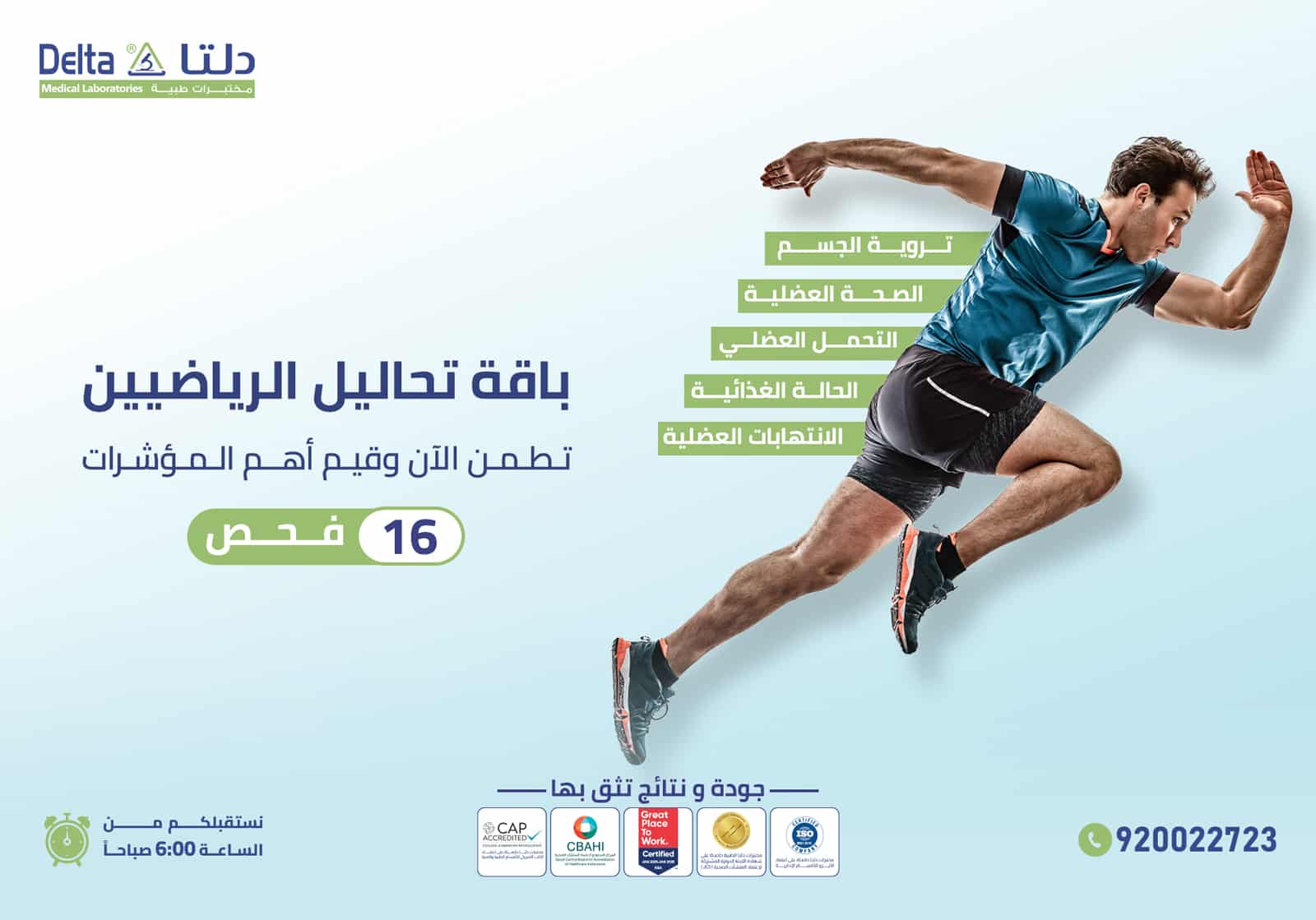 إذا كنت تمارس الرياضة بانتظام أو تسعى للوصول لأفضل أداء بدني، فصحتك لابد أن تكون في أفضل حالاتها، ومع باقة الرياضيين من دلتا يُمكنك الحصول على تقييمًا شاملًا لصحة جسمك، من خلال مجموعة من الفحوصات و ابدأ رحلتك نحو صحة أفضل وأداء أعلى.