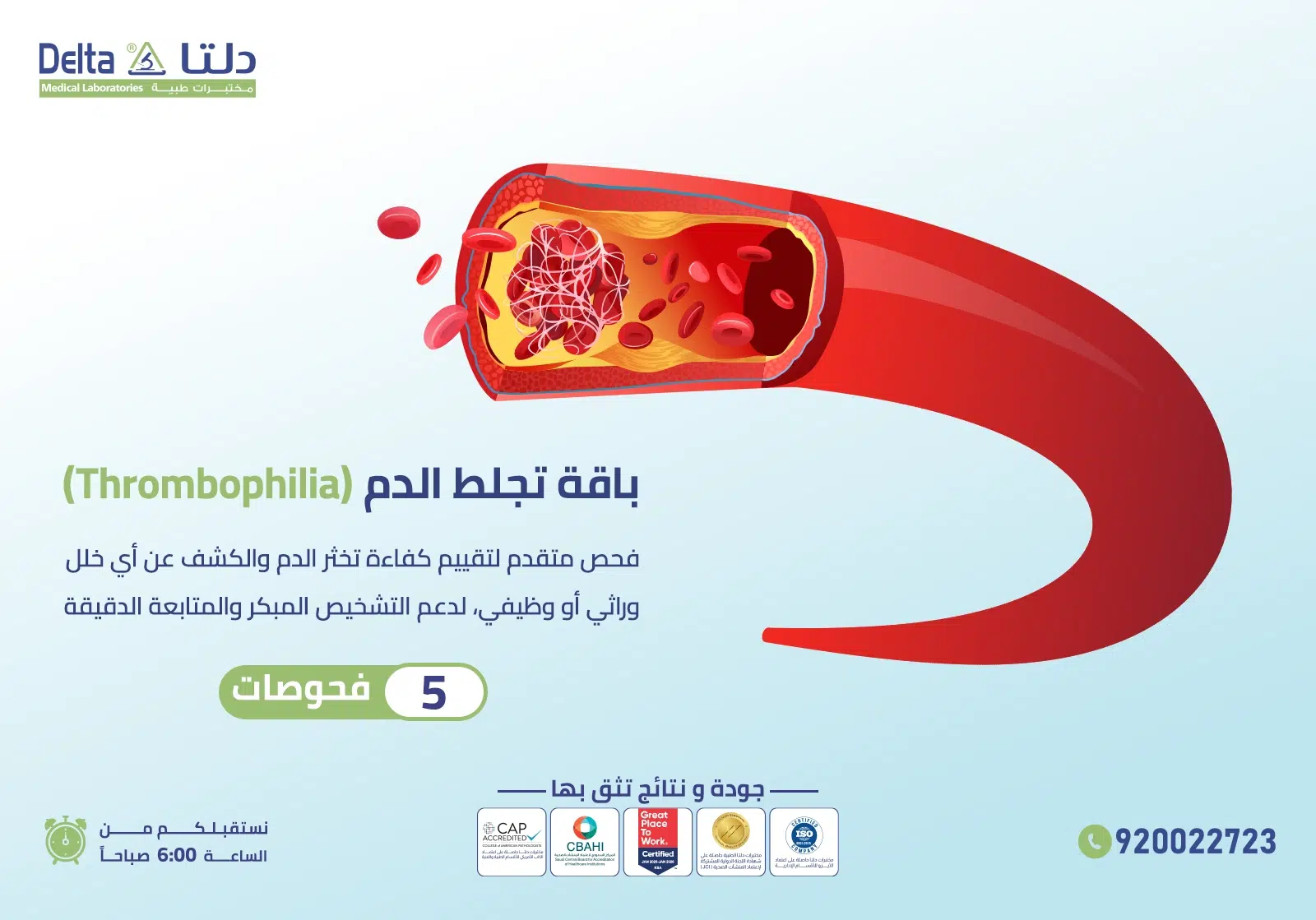 بعض اضطرابات تخثر الدم قد لا تظهر لها أعراض واضحة، لكنها قد تُسبب جلطات أو نزيفًا مفاجئًا مع الوقت، ولكن مع باقة تجلط الدم (Thrombophilia) من مختبرات دلتا تُساعدك على تقييم كفاءة نظام التخثر في جسمك، والكشف عن أي خلل وراثي أو وظيفي قد يؤثر على سيولة الدم، مما يدعم التشخيص المبكر والمتابعة الطبية الدقيقة.