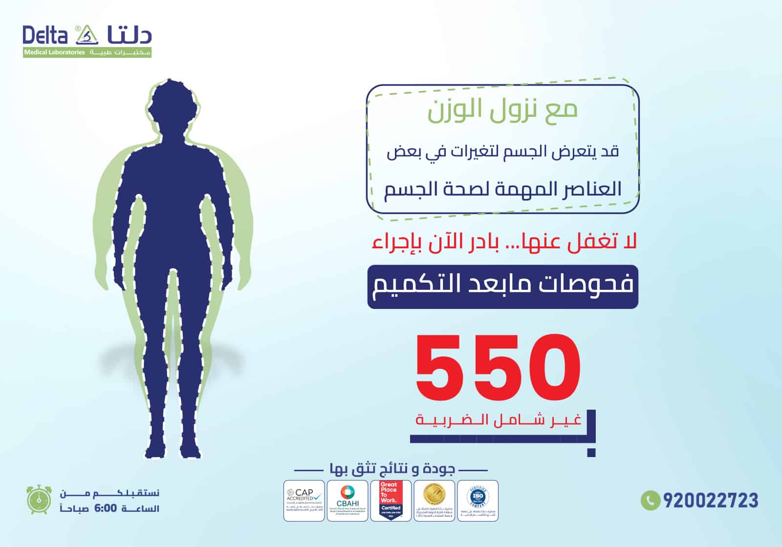 بعد إجراء تكميم المعدة، يصبح مراقبة صحتك خطوة أساسية لاستعادة نشاطك وضمان نتائجك على المدى الطويل لذا راقب وظائف جسمك الحيوية ومدى تأثير عمليات التكميم بمختلف أنواعها على الجسم لتفادي تأثيراتها غير المرغوبة وتقبل الجسم لها من خلال باقة لأهم الفحوصات المخبرية .