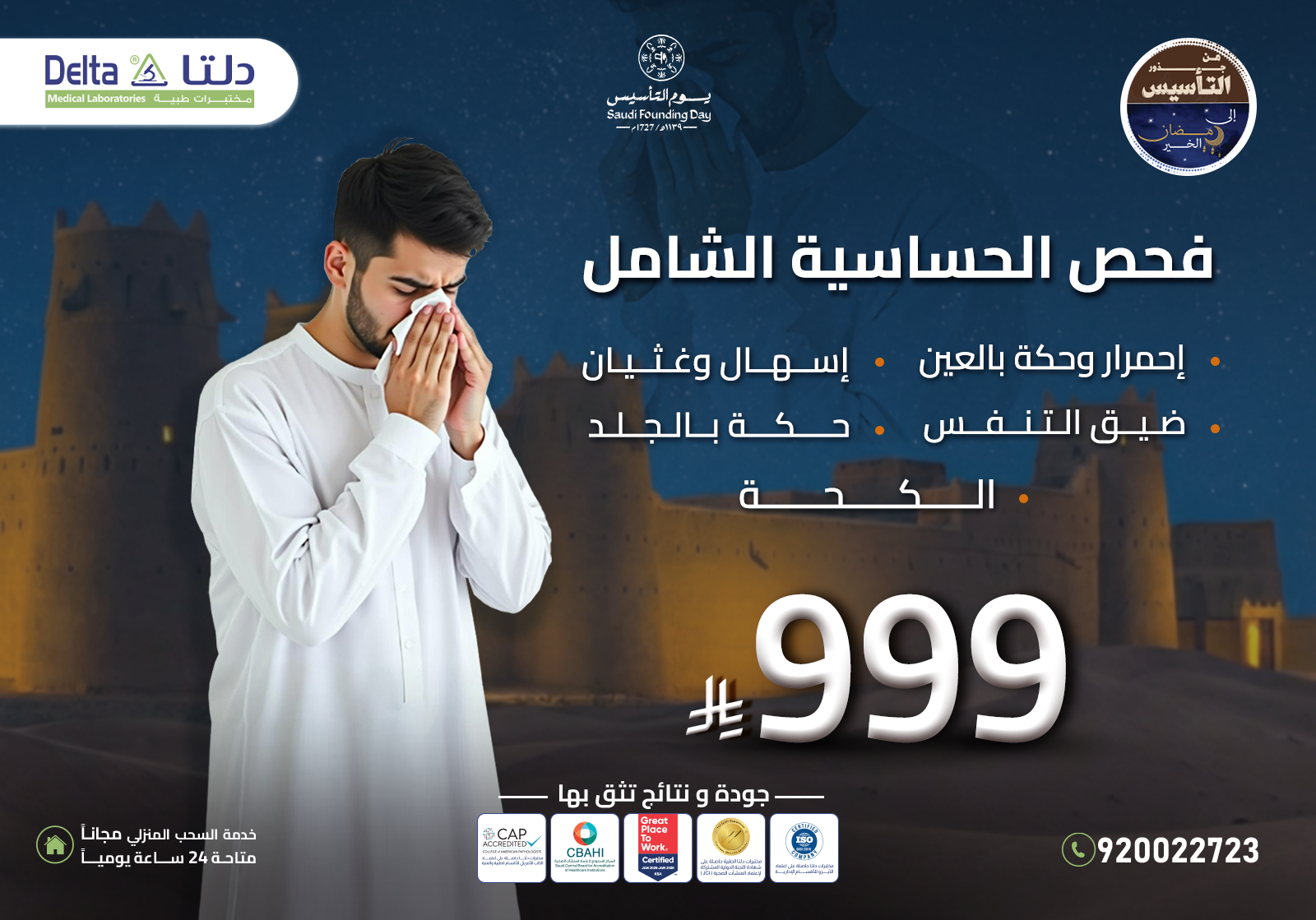 هل تعاني من أعراض غريبة مثل: (العطس المستمر، والحكة، أو صعوبة التنفس) دون سبب واضح حافظ على صحتك مع فحص الحساسية الشامل الذي يفحص 295 نوع من مسببات الحساسية و يتضمن جميع المحسسات الهوائية والغذائية أو سم الحشرات بتقنية ccd-inhibition التي تجنب النتائج الايجابية الخاطئة يتم عن طريق عينة دم واحدة وبنتيجة عالية الدقة
