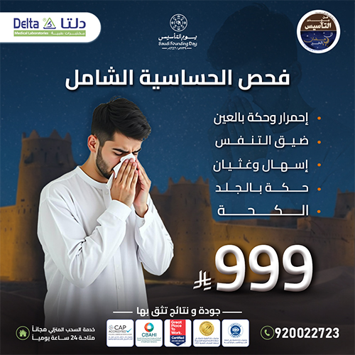 هل تعاني من أعراض غريبة مثل: (العطس المستمر، والحكة، أو صعوبة التنفس) دون سبب واضح حافظ على صحتك مع فحص الحساسية الشامل الذي يفحص 295 نوع من مسببات...